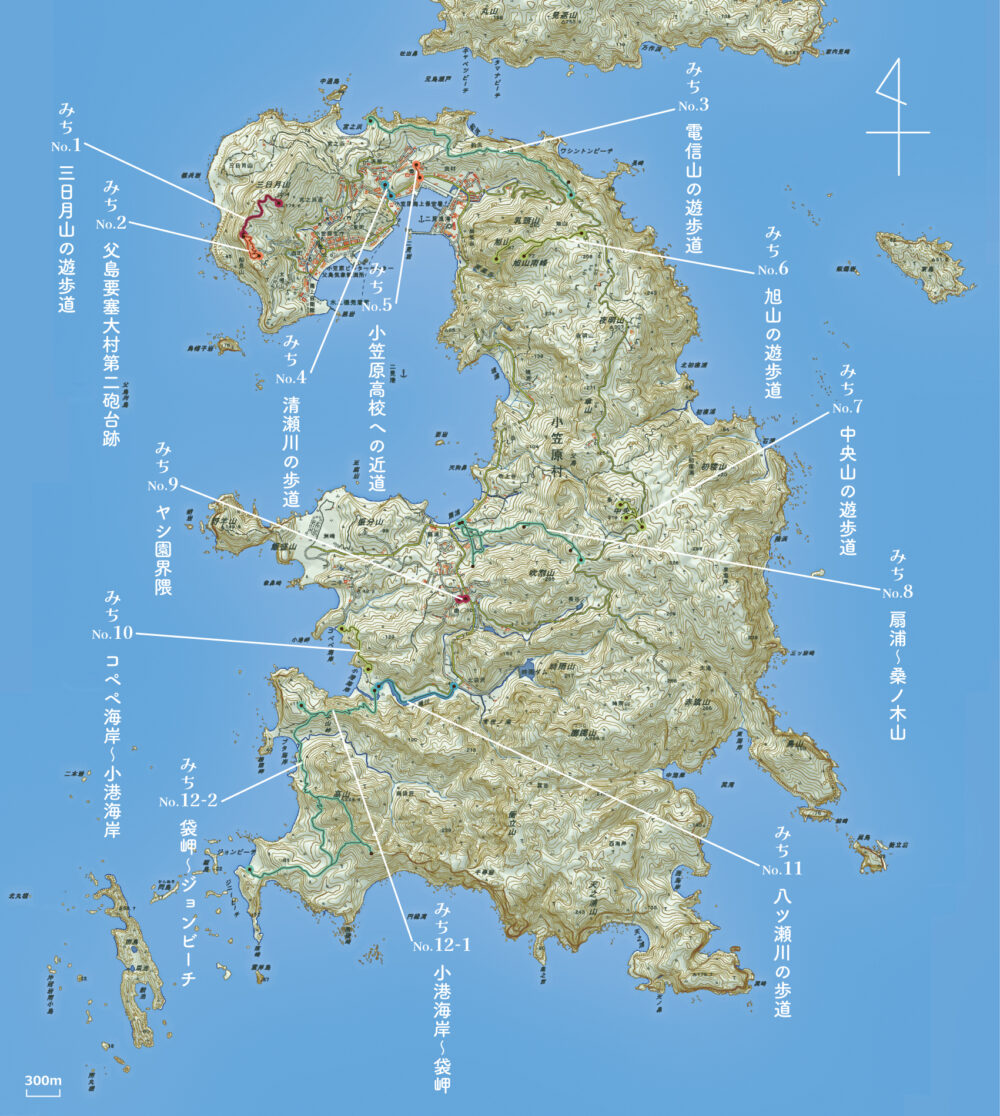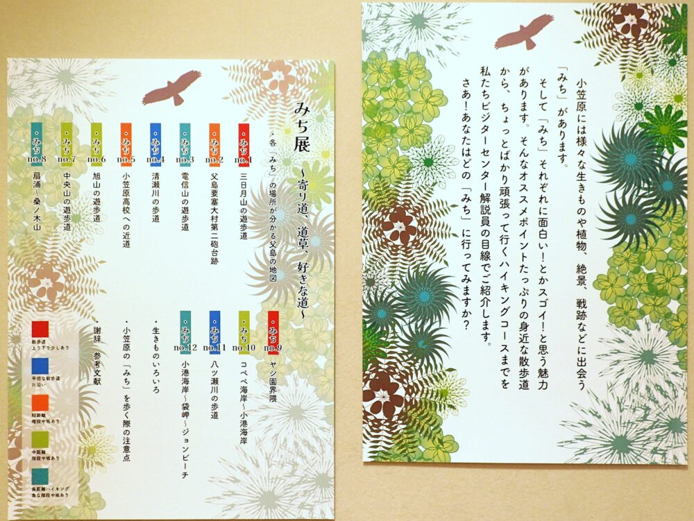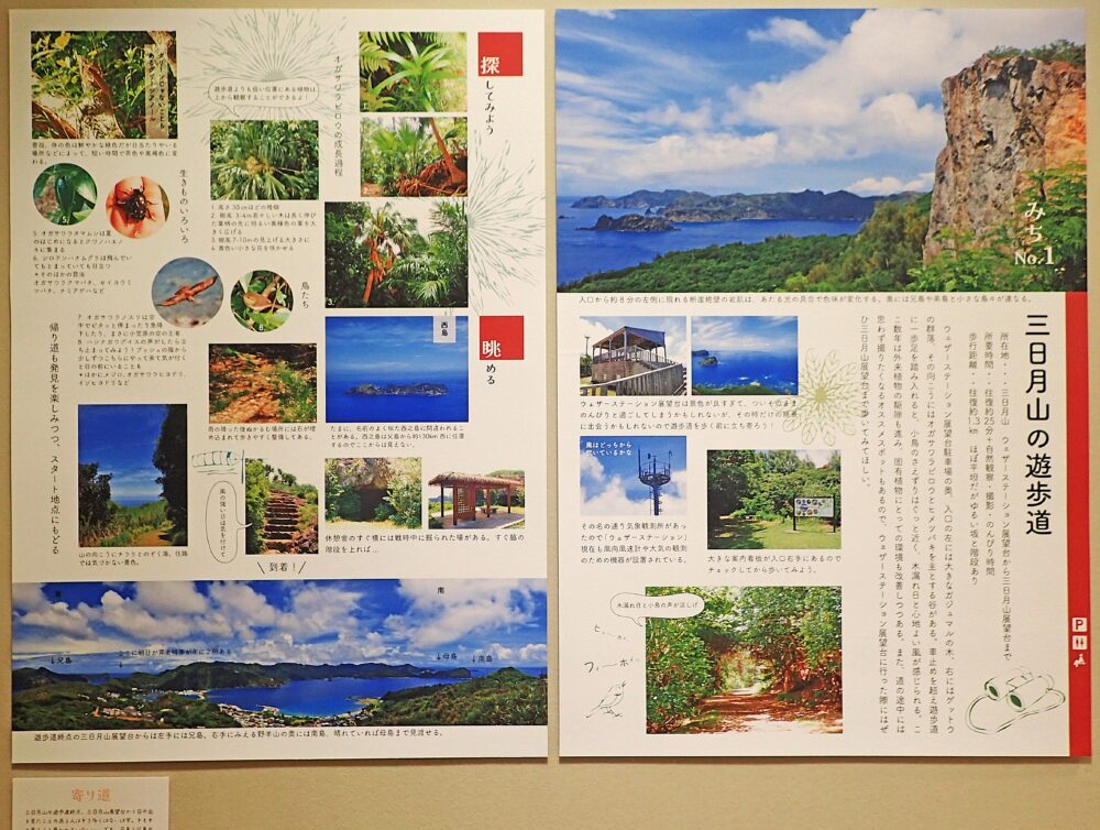 小笠原の夏といえば海遊びでしょ?という声が聞こえてきそうですが陸にも魅力いっぱいなのが小笠原。小笠原ビギナーさんもリピーターさんも島民も、夏こそぜひ観てほしい絶景、探してほしい生きもの、歩いてほしい「みち」があるのです。この展示ではそんなオススメの「みち」12本を雑誌のページをめくるようにご紹介します。