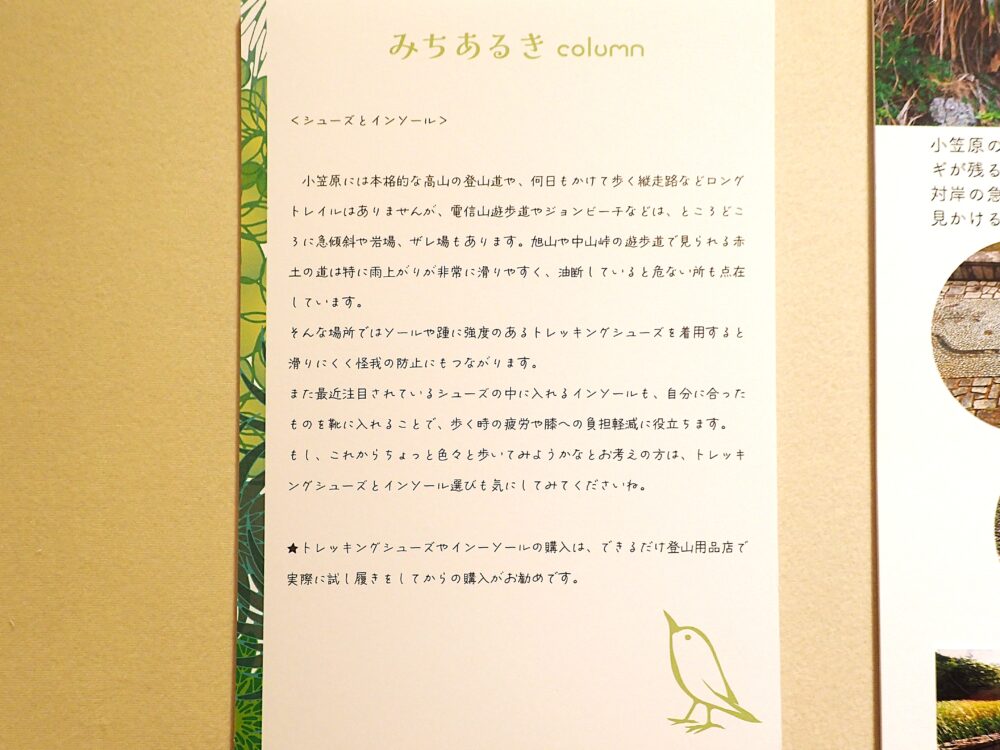 合間の「みちあるきColumn」では、私たち解説員の山歩き、森歩きの経験からお役に立ちそうな話題をコラムとして書いています。たとえば長距離コースの前には!アドバイスとしてシューズなどの装備のことなどが書いてあるコラムもあります。