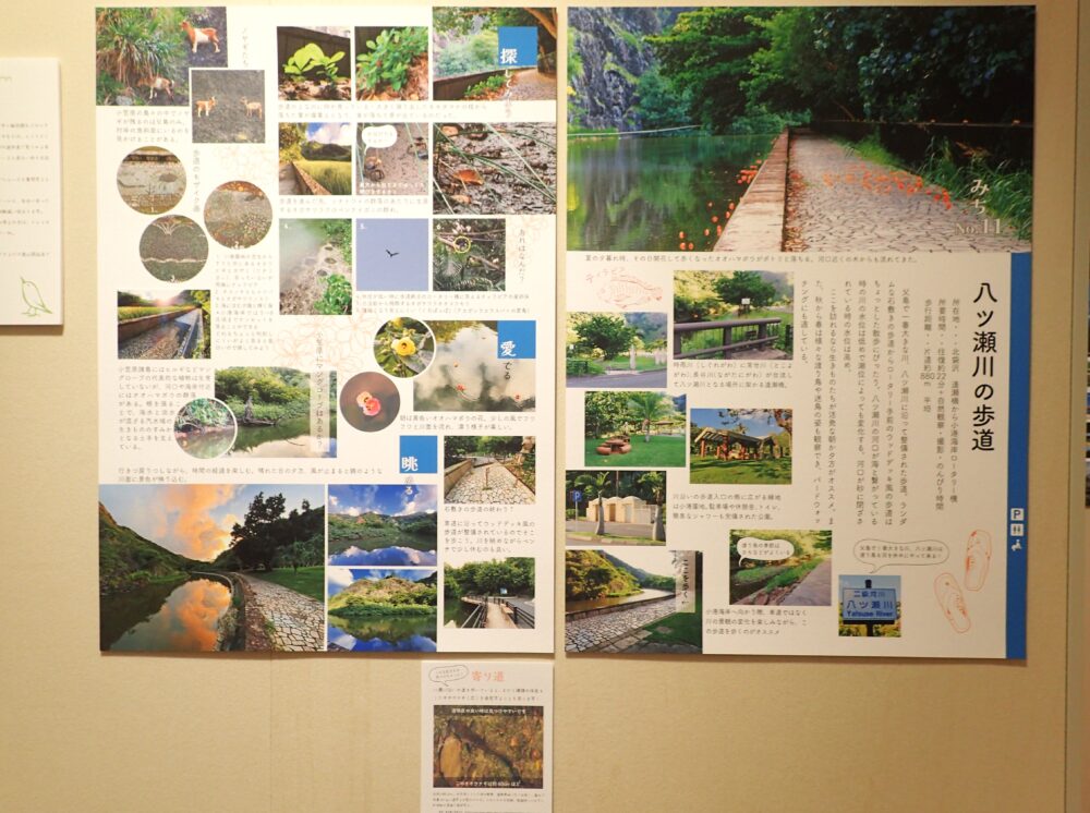 左のパネルの「探してみよう」ではオガサワラクロベンケイガニ、アカガシラカラスバト、オガサワラオオコウモリ、ティラピアの産卵巣、ノヤギ、歩道のモザイク画など、「愛でる」では水面に落ちたオオハマボウと河口付近の植生について、「眺める」では水面に映り込む空や山を紹介しています。