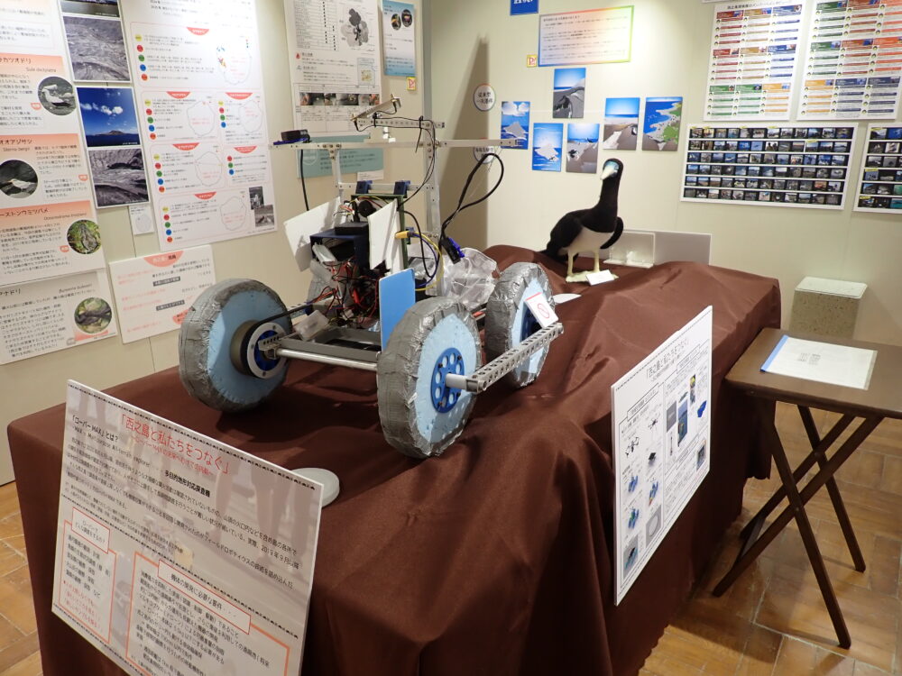 噴火で上陸が難しくなった西之島の新たな調査方法に、遠隔操作での無人航空機ドローン、無人探査機ローバーが加わりました。ビジターセンターではローバー「MAX」を紹介しています。「MAX(Multipurpose All-terrain explorerの略)」とは多目的地形対応探査機で、リモコンで操作します。島内環境の観測・計測、鳥類の生息状況調査(昼・夜)、昆虫類の観察・採取、火山灰の観察・採取、藻類の観察・採取などを行います。今回は数台あるローバーの中でも「MAX-024-05補虫トラップ回収型」を展示しています。実際にローバー走行中にも起こるカツオドリとの対面をリアルに表しています。ぜひ近くでご覧ください。