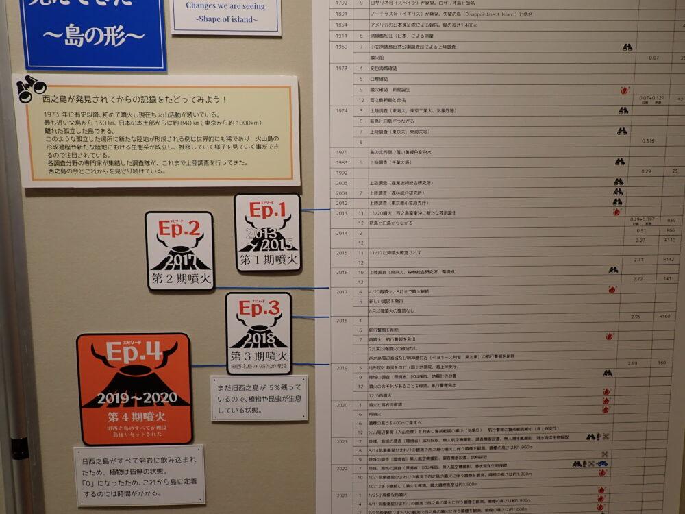 有史以来の西之島の火山活動や調査年を歴史年表にしています。それとともに1947~2025年の島の形の変化を写真で紹介しています。