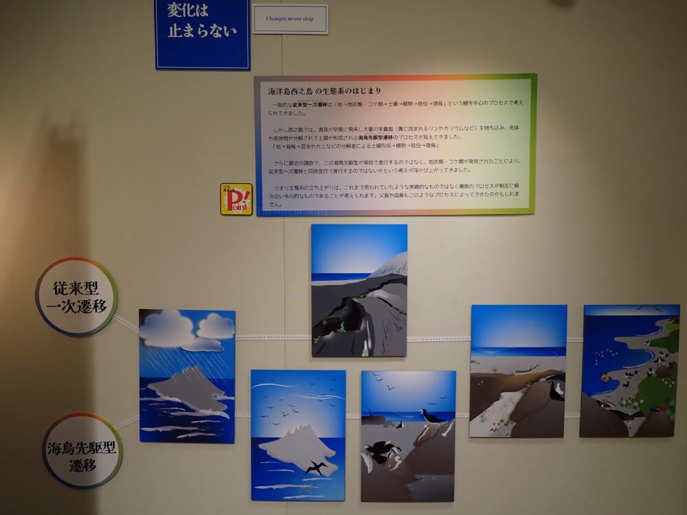 また、最近の調査では藻類やコケ類が発見されていることから、一次遷移と海鳥先駆型遷移の同時並行で進行しているのではないかという考えが浮かび上がってきました。