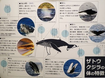 また、展示内ではザトウクジラ達の体の特徴も紹介しています。実際に海に出てクジラ達の姿を間近に感じても大きな感動を覚えますが、海に出る前に体の特徴などを知っておくとよりウォッチングが楽しくなります。頻繁に見られるブロー(潮吹き)や深く潜る際に見られる大きな尾ビレ、また時おり水面に持ち上げることもある長い胸ビレなど、ザトウクジラの特徴的なフォルムやその行動を知っておくと、海に出たときにクジラ達がどういう姿で泳いでいるのか想像しやすくなりますよ。
