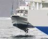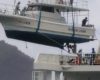 どうやって乗せてどうやって下ろすのか、興味津々で、乗せる所は見損ねましたが、下ろす所は間に合いました!吊り紐からバックして抜けた所はヘ〜!?😳でした。作業員さんを下ろし、このままトビウオ桟橋かと思ったら、青灯台で人を乗せて、試運転に出かけた様です。
