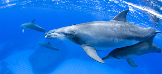 小笠原の紺青の海をクルーズ船に乗り、野生のイルカを探します。イルカを見つけたらまず、船の上から観察。状態が良ければそのまま海に入り夢のドルフィンスイム。イルカを驚かさないようにゆっくり泳げばイルカの方から寄ってくることも。野生のイルカと目が合った時、自然と優しい気持ちになれますよ。