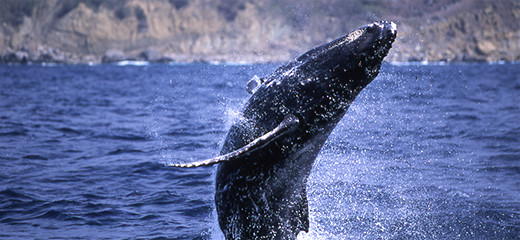 体長13m、重さ40tもの巨体が懸命にジャンプを繰り返す「ブリーチング」は圧巻の迫力!その他にも胸びれや尾びれで海面を叩くなど、様々なアクションで楽しませてくれます。