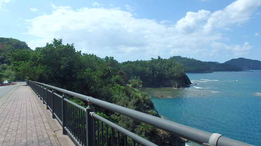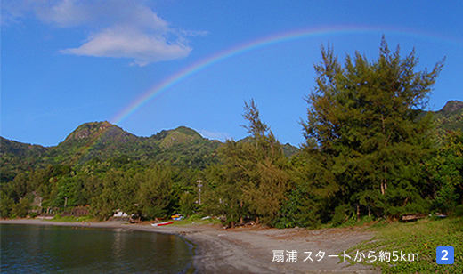 沖合には太平洋戦争中に魚雷攻撃を受け座礁した貨物船の赤さびた姿が残る海岸「境浦」、砂浜で波も穏やかな海水浴に最適な海岸「扇浦」の二つの海岸を目指すコース。境浦までは緩やかな上り坂、そこからは軽いアップダウンを繰り返しながら徐々に扇浦の海岸まで下っていきます。片道5kmで終わらせる場合は、扇浦海岸の目の前より出ている村営バスに乗り街まで戻ってくることが可能ですので、体力に合わせて5kmか10kmかを選んでください。村営バスは運行本数が少ないので、事前確認をお忘れなく!