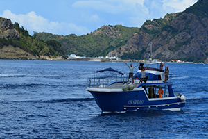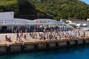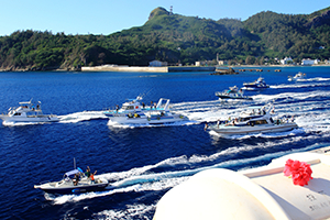 小笠原で誰もが涙を流すこと、それがお見送り。小笠原は1週間に1便しか船が来ないため、お見送りがとにかくすごいんです。岸壁から多くの島民がお見送りをしてくれるのはよく見る船旅の光景ですが、そのあと島中のレジャー船がおがさわら丸を追いかけながらお見送りをしてくれるんです。そのかけ声はさようならじゃなく「いってらっしゃい」。いつまでもいつまでも並走して、最後は海の中に飛び込む!この光景を見た瞬間、訪れた人たちはまた小笠原に帰ってくることを胸に誓うんです。