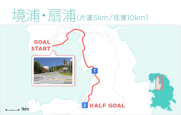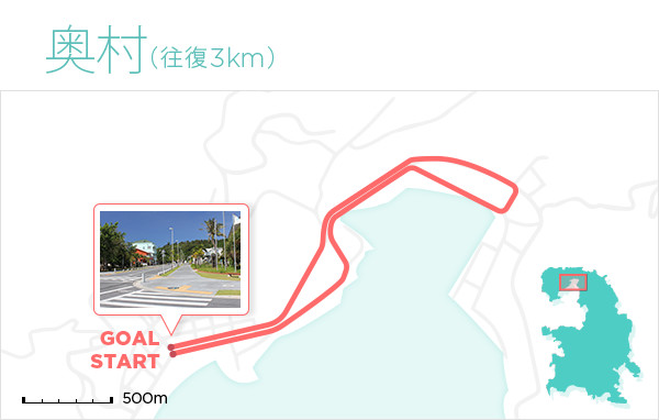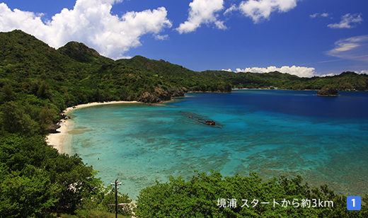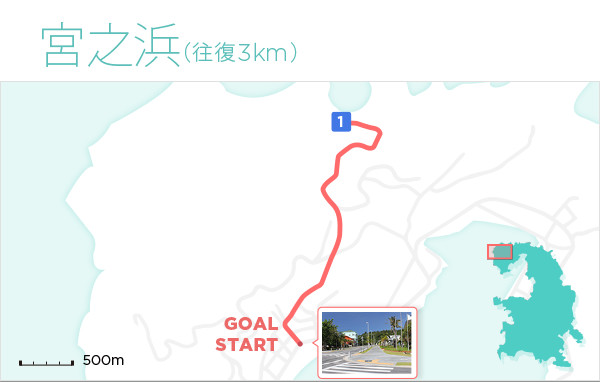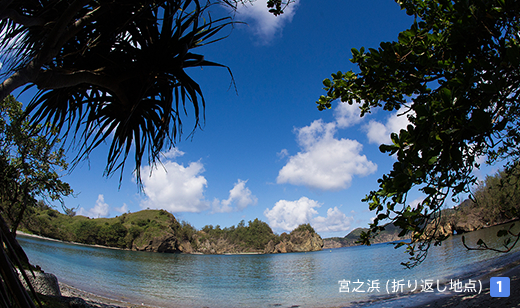 街中からアクセスがしやすい人気ビーチである「宮之浜」を目指すコース。穏やかな美しい海岸。海中には珊瑚が発達し熱帯魚も多いためシュノーケリングに最適で多くの観光客が訪れる。大村の集落から宮之浜入口バス停留所までは上り坂、そこから宮之浜まで下っていくコースのため、フラットな部分はほとんどありません。ビギナーランナーがレベルアップに向けてトレーニングするにはもってこいのコースです。