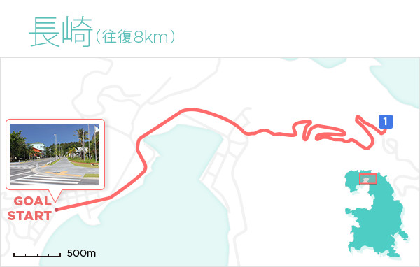 父島でも屈指の景勝地のひとつ「長崎展望台」を目指すコース。兄島と兄島瀬戸を望む展望台で潮流が川のように流れている様子がわかる絶景スポットです。街を抜けた後は2km以上の山登りコースになるため、体力に自信があるランナー向けのコースですがその達成感は大きく、帰りも同じコースを戻ってくるため下り坂でのトレーニングもできます。